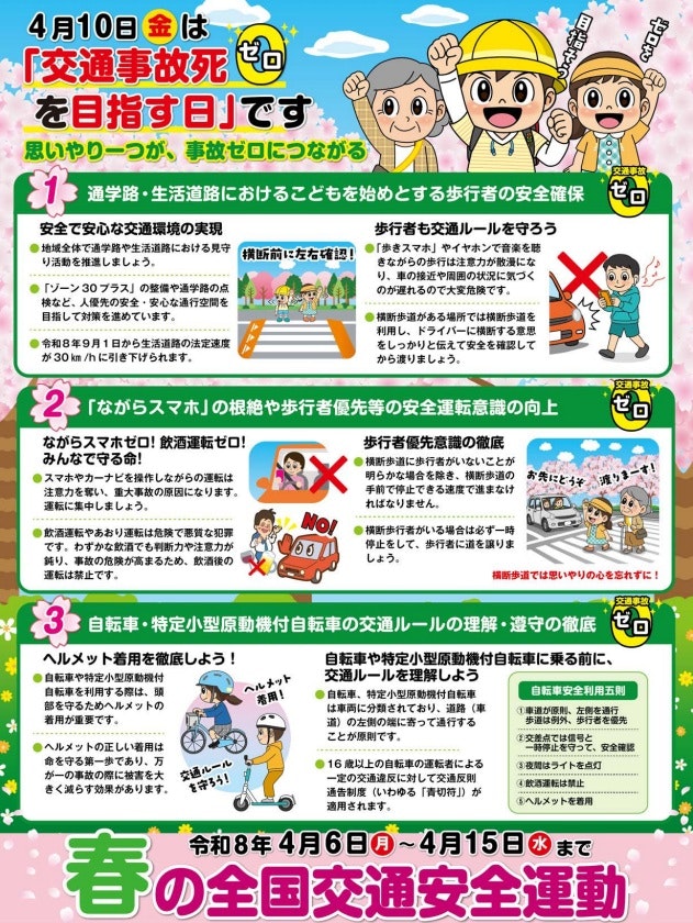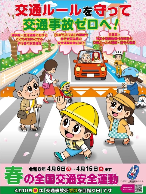 本運動は、広く県民に交通安全思想の普及・浸透を図り、交通ルールの遵守と正しい交通マナーの実践を習慣付けることとともに、国民自身による道路交通環境の改善に向けた取組を推進することにより、交通事故防止の徹底を図ることを目的とし、2026年4月6日(月)から4月15日(水)までの10日間実施されます。